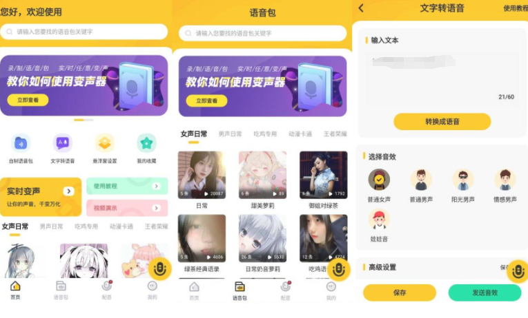 轻松制作出各种搞笑的怪音,绝对是个聊天的必备神器。你在这里不仅可以听到喜欢的明星爱豆语音,更有戏精正太萌妹御姐等不同语音包,让喜欢的声音击中你的灵魂深处。