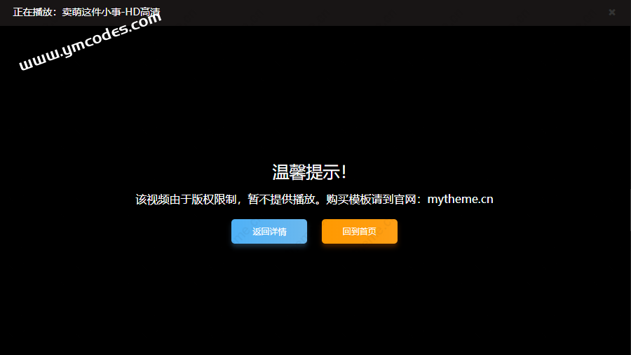 对于收到侵权邮件的小伙伴们应该不在少数,刚刚收录的资源却要遭删除下架的通知,实在可惜,其实我们可以利用苹果cms自带的版权提示功能来屏蔽视频避免删除,下图是设置后的效果,图片中的文字可自定义显示,这样既不会侵权又能优化我们的网站达到了两全其美的效果,具体设置步骤在下面。