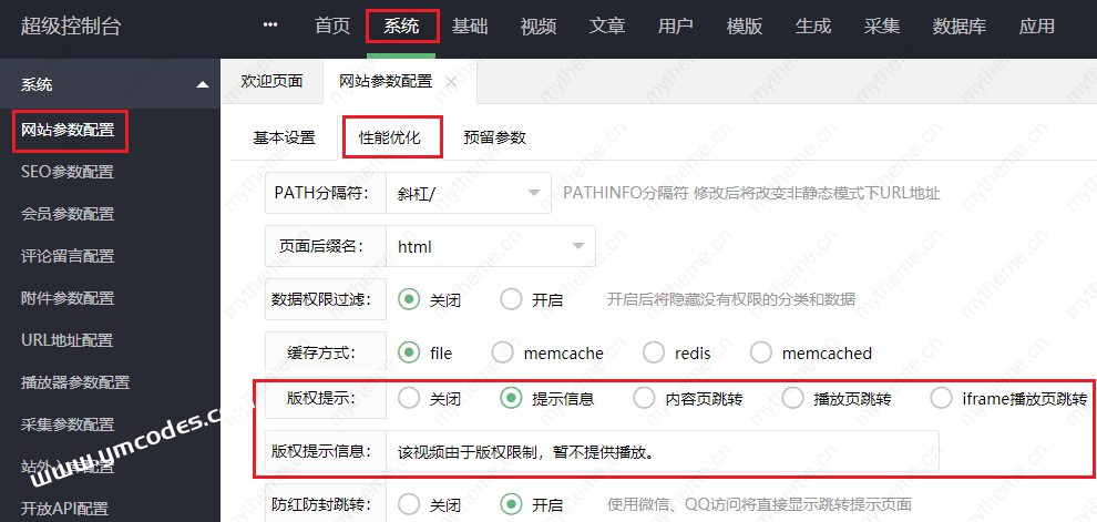 2,首先打开cms后台进入【系统】-【网站参数配置】-【性能优化】版权提示那里选中【提示信息】。【版权提示信息】:可以自定义修改要显示的提示文字。如果选中页面跳转会在打开对应页面时直接跳转至提醒页面,其他选项自行测试,现在只讲一下提示信息的设置。